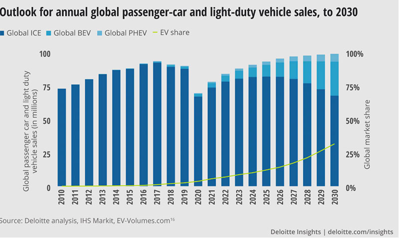 Recently, electric vehicles (EVs) have been introduced as an alternative method of transportation to help mitigate environmental issues, such as carbon emissions and fuel consumption, caused by conventional transportation systems. According to Clean Technica, global sales of EVs (passenger vehicles) jumped 108% in 2021, reaching nearly 6.5 million units, which is the highest growth rate since 2012. Deloitte forecasts there will be a compound annual growth rate of 29 per cent for EV, total sales reaching 31.1 million by 2030 as a result of a slowdown in ICE sales. To date, more than 20 countries have announced the full phase-out of internal combustion engine (ICE) car sales over the next 10-30 years. Undoubtedly, the world transport has switched tracks entering an era of EVs.
