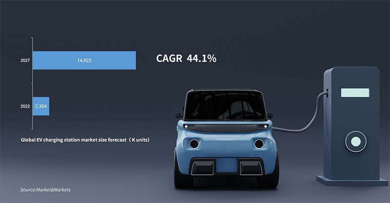 The increasing EVs sales subsequently leads to the growth of EV infrastructure. Market&Markets forecasts that the global electric vehicle charging station market size is projected to grow from 2,354 thousand units in 2022 to 14,623 thousand units by 2027, at a CAGR of 44.1%.